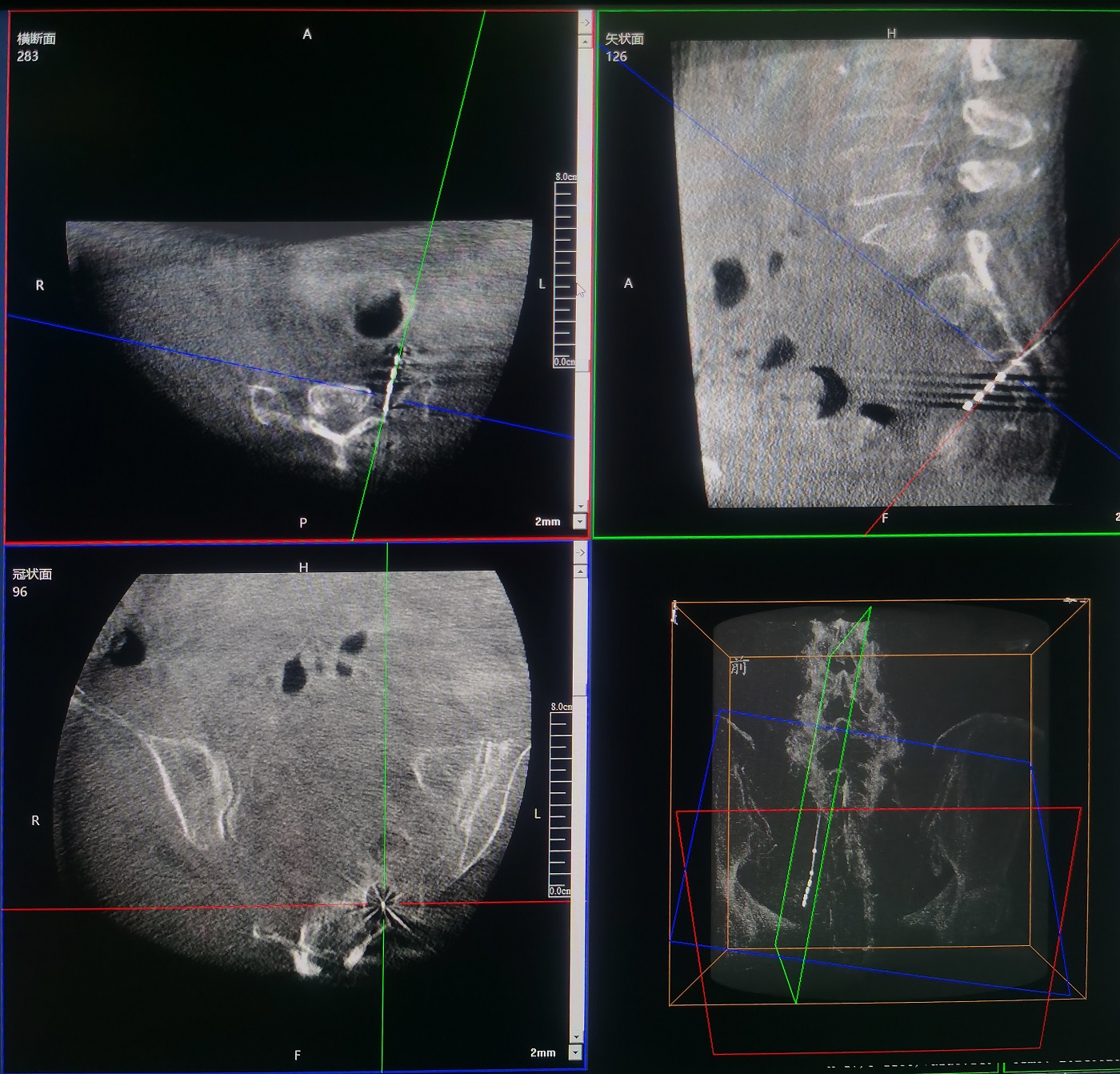 術(shù)中,運(yùn)用普愛(ài)醫(yī)療三維C形臂環(huán)掃,采集骶骨區(qū)域三維圖像,在機(jī)器人導(dǎo)航界面上進(jìn)行路徑規(guī)劃,自動(dòng)引導(dǎo)進(jìn)入骶3神經(jīng)孔。
