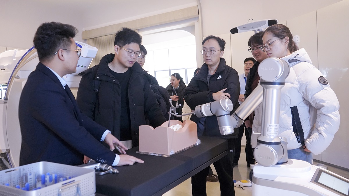 在創(chuàng)新成果展示區(qū),研學(xué)團觀摩了手術(shù)機器人、移動式三維C形臂等設(shè)備,詳細(xì)了解設(shè)備的研發(fā)理念、技術(shù)優(yōu)勢及臨床應(yīng)用場景。