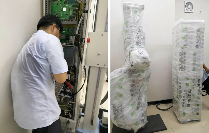 5、 拆除電器柜底腳螺絲,在保證電器柜與立柱連接線容許范圍內(nèi),將電器柜抬高放置,禁止將電器柜睡倒放置。